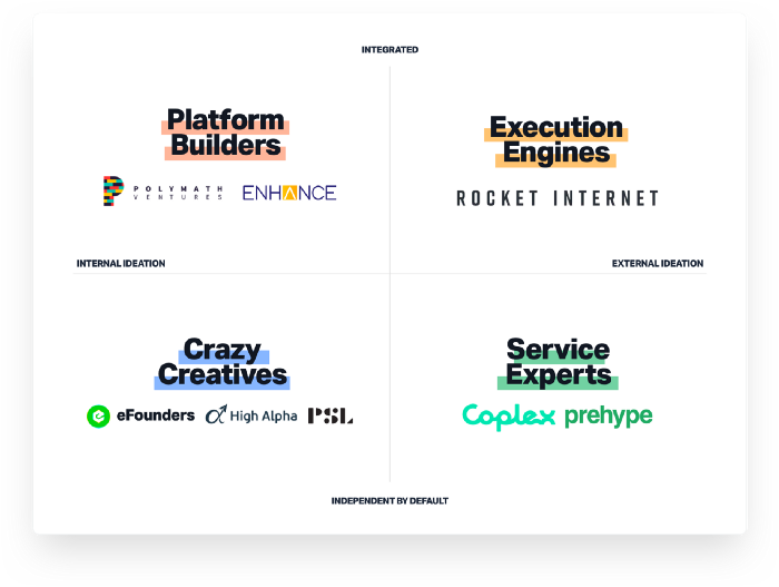 روشهای زیادی برای دسته بندی استارتاپ استودیوها وجود دارد. به عنوان مثال ، eFounders ، یک استارتاپ استودیو مستقر در فرانسه ، ترجیح می دهند صنعت استودیو را بر اساس ارزش پیشنهادی تقسیم بندی کنند (ماتریس زیر را ببینید). آنها می دانند که استودیوها دو فعالیت اصلی دارند (ایده پردازی و چرخش) و آنها استودیوها را بر اساس موقعیتی که در هر یک از این محورها قرار دارند تقسیم می کنند.