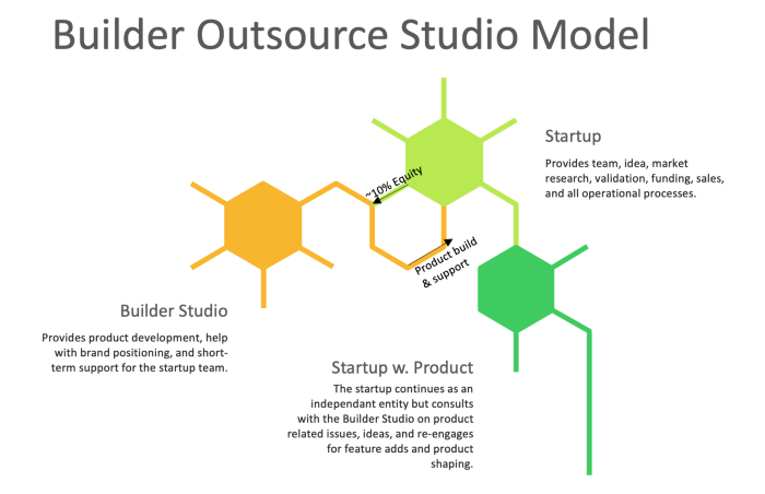 به جای ارائه خدمات تکنولوژیکی با پرداخت هزینه ، Builder Studio اغلب در ازای کمک به ایجاد و مدیریت فناوری ، مقداری از حقوق خود را می گیرد. به دلیل همین برابری ، آنها "درگیر بازی" هستند ، به این معنی که آنها سخت تلاش خواهند کرد تا محصول و استراتژی های رشد را شکل دهند زیرا در نتیجه سهمی دارند. با این حال ، Builders Outsource Studios معمولاً در زمینه استارتاپ فراتر از محصول کار نمی کند- به این معنی که استودیو سازنده در فروش ، بازاریابی ، ارتباطات ، خرید ، تامین مالی یا رشد کمک نمی کند.