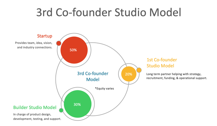 این مدل را به عنوان بنیانگذار فنی "استخدام شده" خود در نظر بگیرید. تیم استودیو با تیم استارتاپ شما برای حل مشکلات و توسعه راه حل های فنی که منجر به موفقیت شرکت می شود ، در کنار هم هستند. اساساً ، استودیو در هر کار دیجیتالی کمک خواهد کرد ، اما در بیشتر موارد ، آنها در فروش ، جمع آوری کمک ، استخدام ، منابع انسانی ، قانونی ، تأمین فضا ، ایجاد سرنخ ، دسترسی به اتصالات یا هر یک دیگر کمک نمی کنند. منابعی که استودیوهای سنتی به آن معروف هستند.