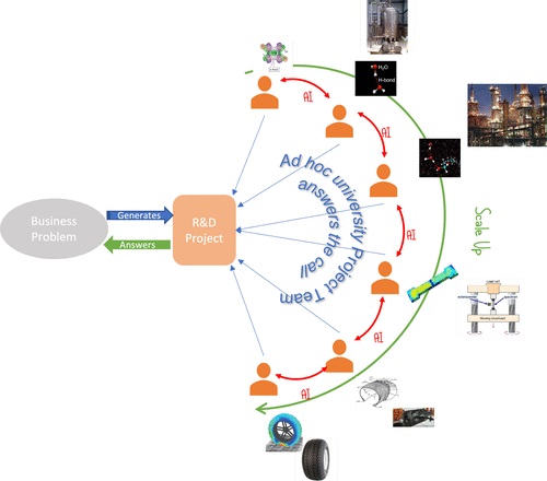 مشکلات صنعتی بسیار پیچیده است. نه تنها فیزیک و شیمی مربوطه دور از ایده‌آل بودن اتفاق می‌افتد، بلکه برای درک آنها به صلاحیت‌های علمی متفاوتی نیز نیاز است. به عنوان مثال، رفتار مکانیکی یک الاستومر پر شده که در یک لاستیک استفاده می‌شود، تحت تأثیر درخواست‌های جاده، توانایی‌های راننده، یا فشار هوا در داخل لاینر داخلی است. همچنین اساساً توسط جزئیات شیمیایی پلیمر مورد استفاده و برهمکنش بین این پلیمر و پرکننده کنترل می شود. بنابراین درک جزئیات چنین مشکلی مستلزم دانش علمی در بسیاری از زمینه ها است و توسط یک آزمایشگاه آکادمیک واحد قابل رسیدگی نیست. ما بر این باوریم که شرکت‌های صنعتی می‌توانند حلقه مفقوده با پیشروی مراکز تحقیقاتی باز، با استفاده از همان رویکردی که NSF یا DOE توسعه می‌دهند، با هدف گردهم‌آوری محققان از حوزه‌های مختلف علمی به سوی یک هدف بزرگ و جاه‌طلبانه یکسان باشند. در این زمینه، همکاری صرفاً بر اساس هدف پروژه خواهد بود. چنین مراکز تحقیقاتی باز و موقت خواهند بود: