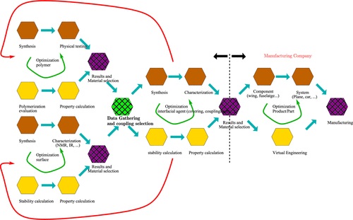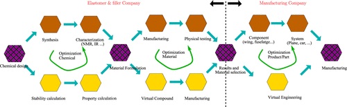 نوع پلیمر (الاستومر در این مورد)، ماهیت و غلظت پرکننده‌ها (سیلیکا یا کربن بلک)، شیمی عوامل اتصال و پوشش (در صورت وجود)، و روشی که برای سنتز/فرآوری مواد و طراحی و ساخت قسمت تایر باید بهینه شود. خواص مکانیکی همراه با خواص خرابی (ساییدگی، شکستگی و غیره) در نظر گرفته شده است. شکل 2 دو مسیر "استاندارد" را نشان می دهد که باید به طور موازی برای انجام این بهینه سازی استفاده شوند. در بالا به رنگ قهوه ای قسمت آزمایشی و در پایین به رنگ طلایی مسیر in silico قرار دارد. قسمت چپ نمودار حوزه شرکت مواد و قسمت سمت راست حوزه شرکت خودروسازی است. اتصال در سطح انتخاب مواد انجام می شود، جایی که خواص مورد نیاز برای سازنده از شرکت متریال درخواست می شود. در برخی موارد، مواد و شرکت های سازنده یکسان هستند.